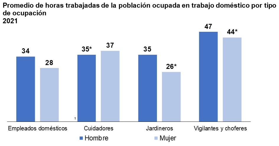 Finalmente, de acuerdo con la ENOE primer trimestre 2021, las personas ocupadas en el trabajo doméstico remunerado perciben ingresos mensuales promedio de 3 300 pesos. Los hombres (4 200) obtienen en promedio mil pesos más que las mujeres (3 200) ocupadas en el trabajo doméstico. Esto se relaciona con que las ocupaciones donde predominan los hombres como la jardinería, vigilantes y choferes, tienen en promedio mayores ingresos mensuales.