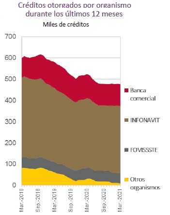 En este sentido, en el periodo abril 2020-marzo 2021, se otorgaron 476 mil créditos para la compra de vivienda nueva o usada. De este total, los créditos de Infonavit y Fovissste representaron 77 por ciento, los de la banca comercial 21.3 por ciento y solo el 1.7 por ciento fueron créditos otorgados por otros organismos públicos.